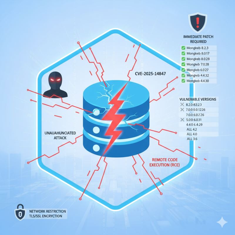 MongoDB警告管理員立即修復嚴重的遠端程式碼執行漏洞2025.12.26資安漏洞針對 MongoDB 最新發布的高風險漏洞 CVE-2025-14847 進行深入分析。該漏洞涉及伺服器端 zlib 處理不當,可能導致未驗證的遠端程式碼執行 (RCE)。