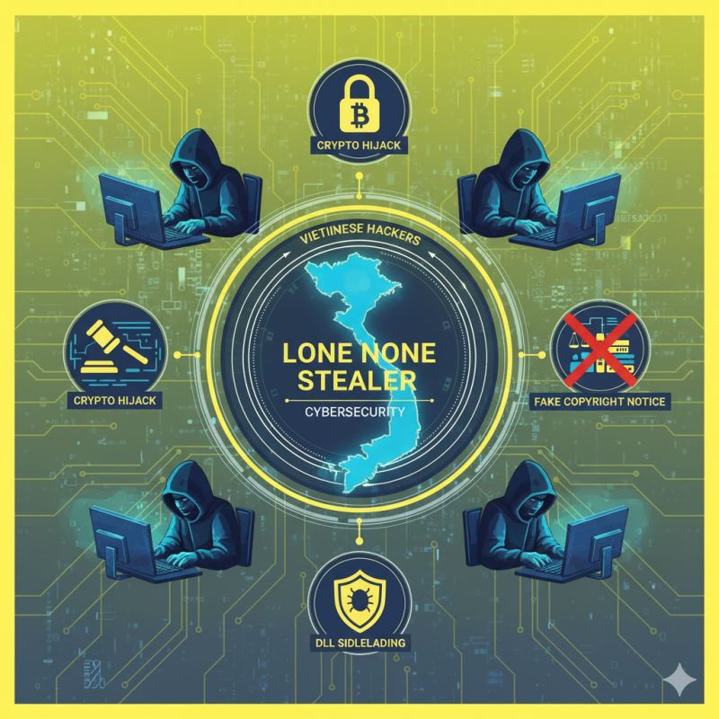 越南駭客利用虛假版權聲明傳播 Lone None 竊取軟體2025.09.26資訊安全網路安全研究公司Cofense Intelligence追蹤到越南駭客組織Lone None的詐騙活動,該組織利用冒充律師事務所的虛假版權通知,透過DLL側載技術部署「Lone None Stealer」惡意軟體,竊取用戶密碼、信用卡和加密貨幣。