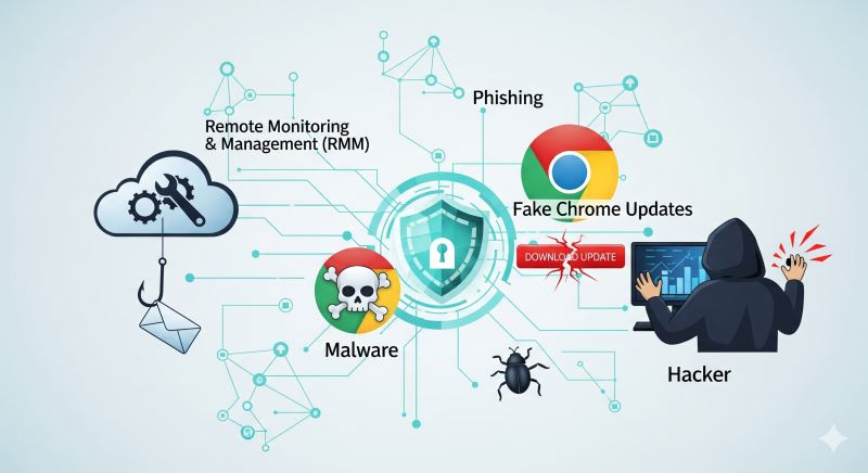 駭客將 RMM 安裝隱藏為虛假的 Chrome 更新和 Teams 邀請2025.09.16資訊安全駭客正在利用遠端監控與管理(RMM)工具發動新一波的網路釣魚攻擊,探討駭客如何偽裝成虛假的 Chrome 更新或 Teams 邀請,藉此規避傳統安全防禦,並提供企業與個人應對此威脅的防禦策略,確保系統安全。
