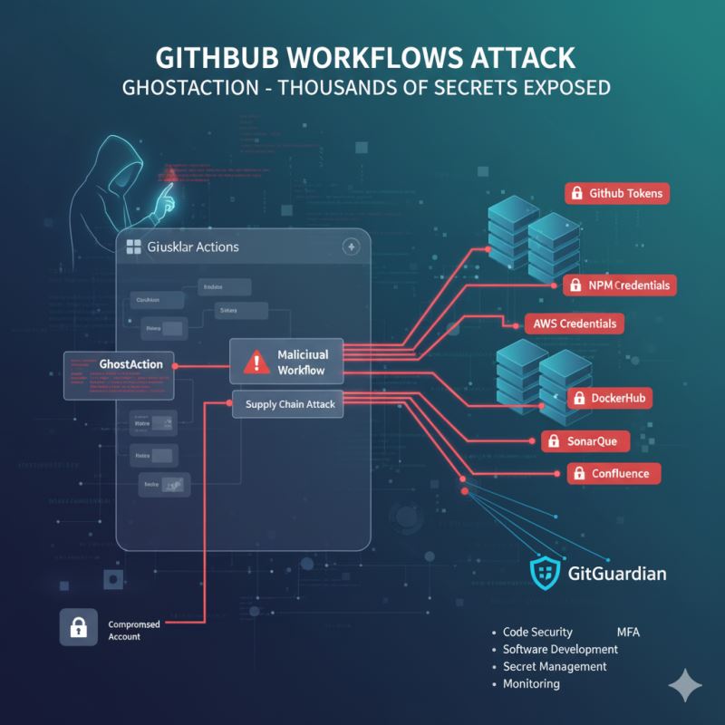 GitHub Workflows 攻擊影響數百個程式碼庫和數千個機密訊息2025.09.09資訊安全開發安全公司GitGuardian揭露名為GhostAction的供應鏈攻擊,駭客利用惡意GitHub Actions工作流程竊取數百個儲存庫和數千個機密。