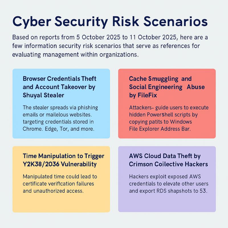2025年10月第二週 資訊安全威脅情資2025.10.12資安風險本頁整理自 2025 年 10 月 5 日至 11 日間的資安媒體報導與台灣應用軟件資安日報,彙整四則重大資安威脅情資,包括 Shuyal Stealer 多瀏覽器憑證竊取、FileFix 快取走私與社會工程攻擊、Y2K38/2036 時間操縱漏洞,以及 Crimson Collective 駭客濫用 AWS IAM 權限進行雲端資料外洩。提供企業進行資安風險評估、系統設定檢查與應變計畫制定之參考。完整分析請參閱台灣應用軟件資安週報或聯繫我們取得詳細資料。