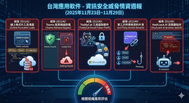本週資安週報揭示五大高風險情境:線上格式化工具導致憑證與密鑰外洩、Microsoft Teams 架構漏洞讓惡意檔案繞過防護、ToddyCat 新工具竊取郵件與 OAuth Token、第三方供應商駭入造成 OpenAI API 用戶資料外洩,以及 HashJack 技術劫持 AI 瀏覽器與助理。提供風險評估與應對策略,協助企業強化資安防線。