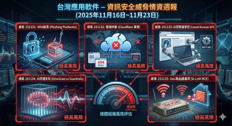 2025年11月第三週 資訊安全威脅情資2025.11.24資安風險本週資安情資揭示五大高風險情境:成熟型 2FA Phishing 平台讓 MFA 防護失效、Cloudflare 異常導致全球網站中斷、AI 瀏覽器隱藏 API 引發裝置全面掌控、EchoGram 技術穿透 LLM Guardrails、防護失效,以及 D-Link EoL 路由器 RCE 漏洞造成邊界防線崩潰。提供風險評估與應對策略,協助企業強化資安韌性。