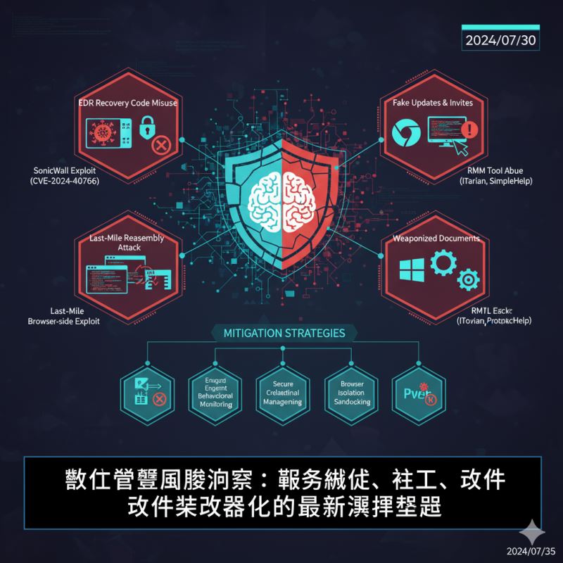 本週威脅情資探討剖析當前企業面臨的四大資安風險:勒索軟體利用 EDR 漏洞、社交工程濫用 RMM 工具、瀏覽器「最後一哩重組攻擊」及文件惡意注入。提供相關的技術與管理應對策略,助您強化端點與網路防護,提升企業數位韌性。