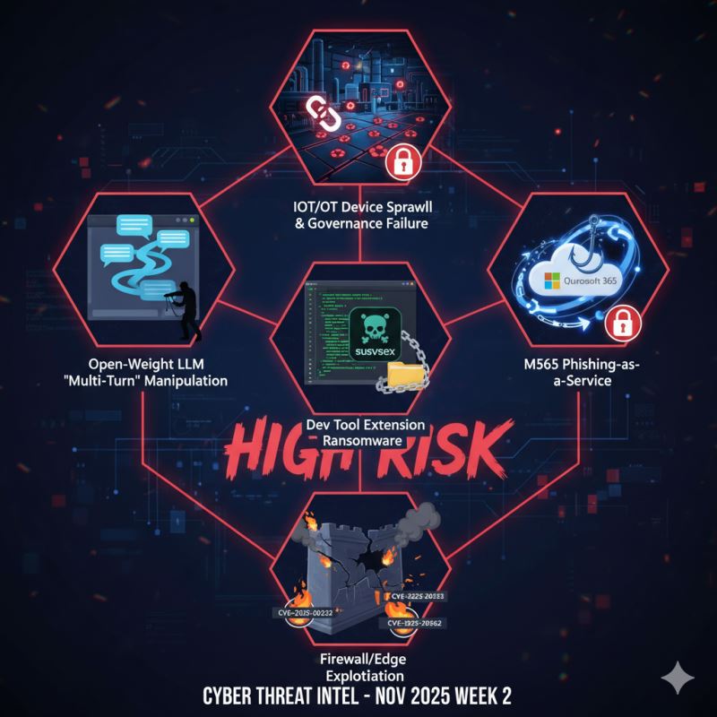 2025年11月第二週 資訊安全威脅情資2025.11.16資安風險本週資安威脅情資深度分析(2025/11/09-11/15):探討製造業/能源業的 未治理 IoT/OT 裝置暴露風險;針對 開放權重 LLM 的長對話操控 威脅;開發工具擴充功能的惡意滲透 危機;專門針對 Microsoft 365 帳號的 PhaaS 釣魚攻擊;以及 Cisco ASA 防火牆零日漏洞(RCE)的主動利用。